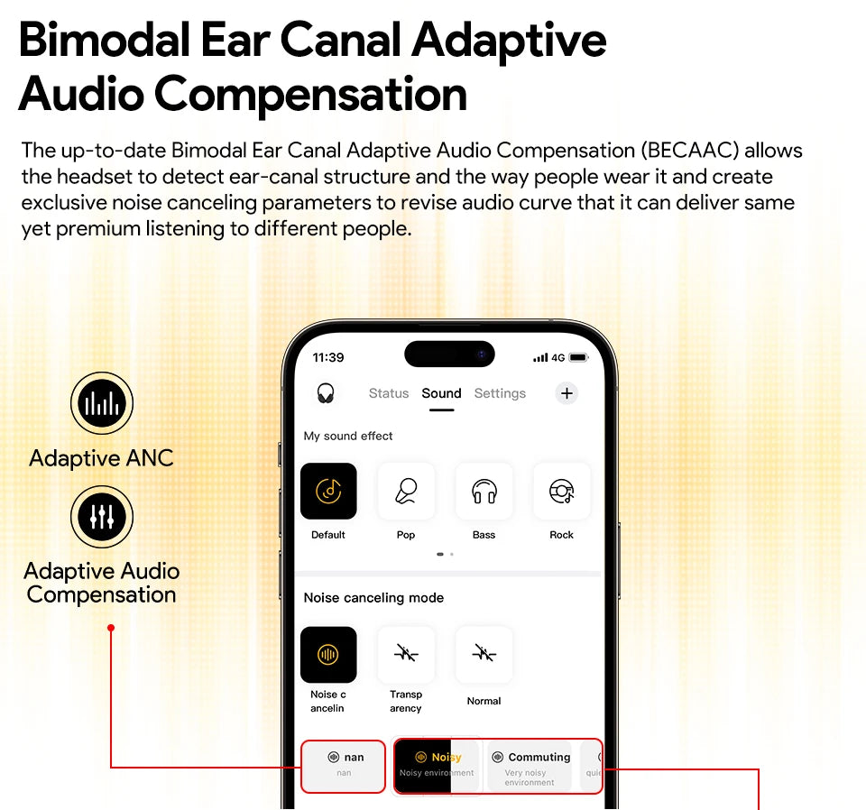 Feature 3: Bimodal Ear Canal Adaptive Audio Compensation,ANC and EQ dual adaptive technology